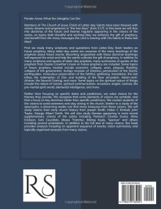 Rather than focusing on specific dates and predictions, we value visions for the themes they provide. We recognize that some elements of visions are symbolic, and that a focus on key doctrines rather than specific predictions. We caution students of the visions to avoid extremes and stay strong in the church. Similar to a study of the apocrypha, a discerning reader can find many treasures from these visions. We will study visions from early church history from Joseph Smith, Heber C Kimball, John Taylor, George Albert Smith. We will also study themes appearing in more recent supplementary visions of the saints including Patriarch Charles Evans, Alma Erickson, Sols Caurdisto, Moses Thatcher, Bishop Koyle, ‘Spencer’ and others including several protestants. In addition to the full text of many visions, this book provides analysis including an apparent sequence of events, vision summaries, and topically organized excerpts from many visions.
